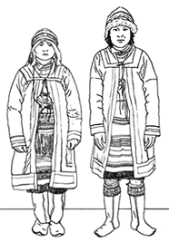 Das äußere Erscheinungsbild der beiden Geschlechter ist so ähnlich, dass man kaum Mann und Frau unterscheiden kann. Männer haben keinen Bart und tragen ihr Haar lang, so dass sie wie Frauen aussehen und auch ihre Kleidung ist fast die gleiche wie die einer Frau. Beide tragen Lederjacken mit roten und schwarzen Besätzen, Lederhosen, weiche Lederschuhe und die gleichen Kappen. Die Unterschiede: Frauen haben einen Zopf und eine etwas größere Basis (breiteres Becken).