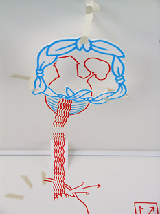 | Noch 4 Tage bis zur Eröffnung von "Am Gängelband der Affekte"! Links vorne der Schnittplatz, dahinter der Computerarbeitsplatz und rechts vorne mein Schlafplatz. |
