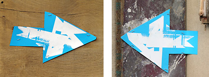 Ähnlich unsympatisch sind diese vom Kunstwollen entstellten Pfeile an- gebracht waren sie an einer Hütte in der "City of Names", einem Projekt auf dem Mariannenplatz parallel zu der Graffiti-Kunst Ausstellung "Backjumps" im Bethanien, die auch im August 2005 stattfand... gut möglich, dass aus de- ren Umfeld auch der Autor der Pfeile oben kommt. |