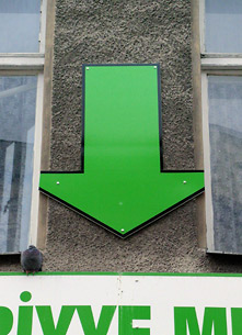 Lieblingspfeil Nr. 580 Beschnittener Pfeil Hier nimmt Werbung mal ausnahms- weise Rücksicht auf die Bewohner des Hauses, an der die Werbung ange- bracht ist: die eigentlich in die Fenster- öffnungen reinragenden Pfeilspitzen wurden gekappt. (Vielleicht hat sich ja auch nur ein Me- diengestalter-Azubi im ersten Lehrjahr vermessen und verrechnet und so die Sache retten wollen... ) |