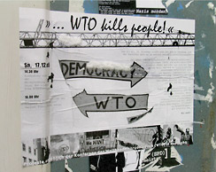 Waren sie am 07.11.2004 auf einem Plakat noch so winzig, dass sie kaum auszumachen waren, haben die Lieb- lingspfeile Nr. 269 inzwischen Karriere gemacht und sind jetzt das zentrale Plakatmotiv. Weshalb das aktuelle Winterwetter nur dass, doch in eine positve Zukunft, in Deutschland also in Leserichtung nach rechts zeigende, "DEMOCRACY" ver- eist hat und die böse, unprogressive und hier natürlich nach links weisende, "WTO" nicht? Bevorzugt die Wettergöttin etwa das nach links Zeigen und nach rechts Denken? |