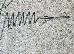 Lieblingspfeil Nr. 695 Wenig zielstrebiger Pfeil Dieser Pfeil auf kieseligen Waschbeton beginnt und endet ausgesprochen unendschieden, also wenig pfeilig: die Pfeilbahn ist ein wildes Zickzack und endet in einer großschlaufigen Schleifenpfeilspitze, deren Zeige-kraft durch die, wie ein Airbag vor der Spitze sitzenden, Schlaufe gedämpft zu sein scheint. |