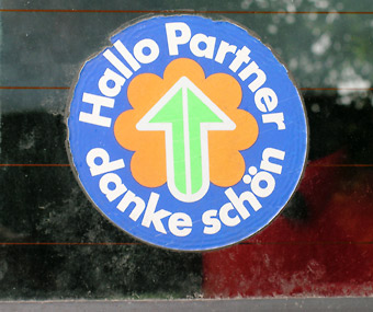 Lieblingspfeil Nr. 696 Harmonische Pfeilhälften Wenn ich mich richtig erinnere, ist der vor zwei Tagen fotografierte Auto-Auf- kleber links aus den 70iger Jahren. Damals startete der Deutsche Ver- kehrssicherheitsrat und der ADAC mit dem Slogan "Hallo Partner danke schön" auf Plakaten und in Werbespots und dem Song "Lasst die Straßen freundlich werden" von Peggy March die zweite große Verkehrsbefriedungs- Kampagne, nachdem in den 60iger Jahren der Versuch, eine neue Ent- schuldigungs-Geste, ein mit zwei Fin- gern und dem Daumen gebildetes "E" wie "Entschuldigung", zu etablieren, kläglich gescheitert war. Die "Partner" werden wohl mit den zwei Pfeilhäften symbolisiert, die, da man sich verträgt, gemeinsam ein Ziel an- visieren können. |