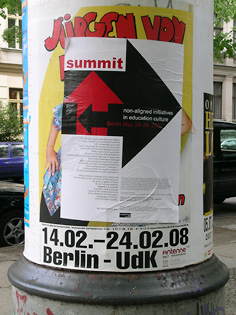 Lieblingspfeile Nr. 883 Pfeile als Blickfang Aus drei Pfeilen zusammengesetzt ist das Symbol auf diesem wild plakatier- ten Plakat, das auf einen Gipfel (engl. summit), einem Treffen von Initiati- ven und Protagonisten hinweist, die, der Idee der Bewegung der Blockfreien [Staaten] engl. Non-Aligned Move- ment verpflichtet, über Ausbildung und Wissensvermittlung debattieren wollen. Die drei Pfeile symbolisieren Orientie- rungslosigkeit, Richtungskämpfe oder Unübersichtlichkeit? Egal: sie erzeu- gen Aufmerksamkeit... SUMMIT non-aligned initiatives in education culture Berlin 24.-28. Mai 2007 Wie ist Wissen jenseits von Uni, Schule und traditionellen Lexika-Redaktionen zugänglich? Organisieren sich Wissen und Bildung neu? Und welche politischen Folgerungen wären daraus zu ziehen? |