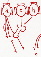 Ein Pfeil mit gepunkteter Pfeilbahn ist nie besonders zeigekräftig, in diesem Fall sind allerdings auch noch die Punkte der Pfeilbahn und die Pfeilspitze mit einer zeichnerischen Variante ihrer selbst gefüllt – und so Doppelungen helfen erstaunlicher Weise fast nie, die Zeigewirkung zu stärken.