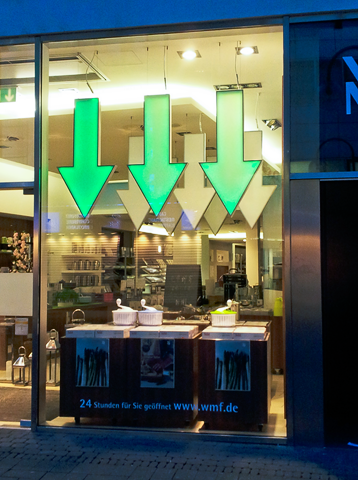 Lieblingspfeil Nr. 1365 Pfeil-Staffelung Schaufenster sind nicht nur die Visitenkarte jedes Geschäfts, sie sind immer noch eine der wichtigsten und effektivsten Möglichkeiten für einen Ladenbetreiber, Aufmerksamkeit zu erzeugen. Und Pfeile generierten Aufmerksamkeit. Nicht zuletzt auch deshalb, weil man es sich einfach nicht leisten kann, seriös wirkende Pfeile mal eben so zu ignorieren. Zu groß Risiko, dass die auf etwas Wesentliches zeigen... Als Faustregel für die Gestaltung von Schaufenstern gilt: ein Fenster muss aus einem Abstand von etwas über 7 Metern gut wahrnehm- und interpretierbar sein. (24-Feet-Regel) Von der Warenanordnung im Schaufenster bietet sich neben der Gruppengestaltung*, dem Blocken**, der Streugestaltung*** auch die in unserem Beispiel genutzte Reihengestaltung (z. B. drei gleiche Artikel in einer Reihe) an: die so entstehende Ordnung und Harmonie erhöht die Aufmerksamkeit. |