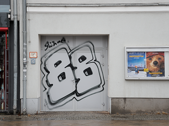 Kurz vor dem Beginn der diesjährigen Berlinale hat es dann doch noch geklappt, dass das Kino Toni am Antonplatz offen war, als ich gerade vorbei kam. Und so sprach ich mit der Frau an der Kasse über das recht frische Graffiti an der eben erneuerten Tür zur Hofeinfahrt. Und die versprach, mit ihrer Chefin über meinen Hinweis zu reden. Und vielleicht war diese kleine Initiative der Grund, weshalb dann zu Beginn des Festivals, bei dem das Kino eine offizielle Abspielstätte von Festivalfilmen sein sollte, dass höchstwahrscheinlich positiv auf eine Nazi-Thematik* verweisende Graffiti verschwunden war. Kurze Zeit später hatte schon wieder jemand auf dem Tor verewigt... |
