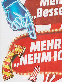 Lieblingspfeil Nr. 1402 Pfeile suggerieren Tradition Es ist meist einen zweiten Blick wert, wenn die zeigende Hand, der Vorläufer des Pfeils, gleichzeitig mit Pfeilen zum Einsatz kommt. In diesem Beispiel, dass ich bei der Anreise zu meinem Pfeilvortrag vor dem Bremer Hauptbahnhof entdeckt habe, wirbt die Hand zusammen mit Retro-Pfeilen für angeblich besonders günstige Angebote anläßlich des Geburtstags eines Elektro-Markts, der gerade Mal 25 Jahre alt wurde und damit deutlich jünger ist als alle in der Werbung benutzten Pfeile: wer keine Tradition hat, muss diese eben suggerieren... |