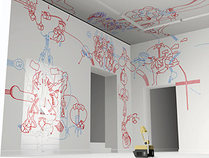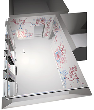 Drei Türen Eingangssituation mit Projektion: der kleinere Durchgang (rechts) ist der Durchgang, durch den man den Raum (den sogenannten Saal 2) betritt. Durch den Größeren (links) geht man weiter in den Saal 3 und die Projektion ist genauso groß wie die Eingangstür... und ist der "Einstieg" in das Bildprogramm.