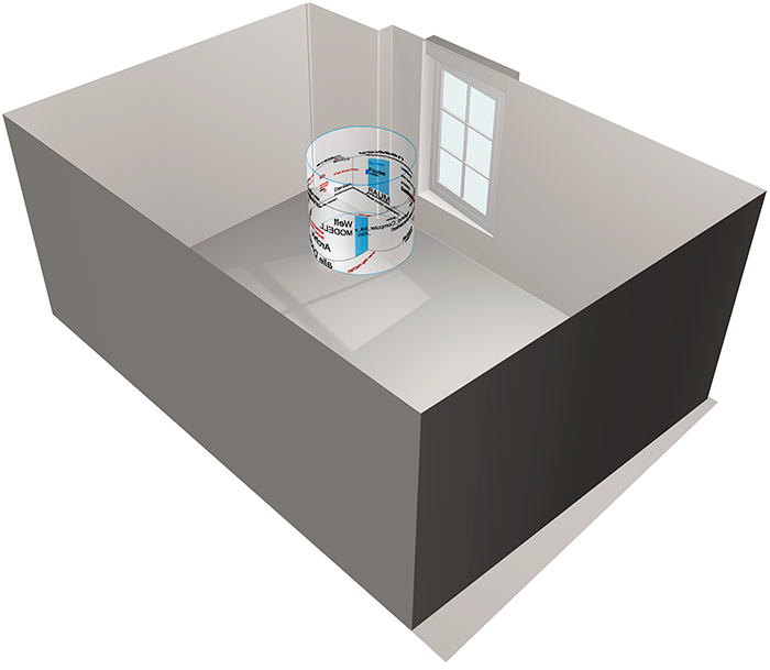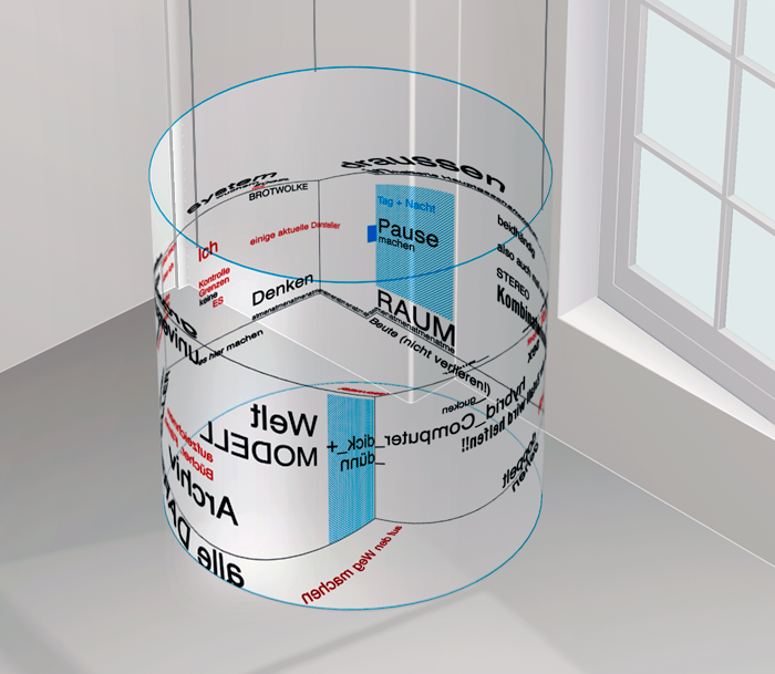Die Textebene im Zylinder: entwickelt mit Hilfe eines 3D-Modells des Ausstellungsraums, mit dessen Hilfe dann eine QTVR-Abwicklung ausgedruckt und dann vor Ort unter der Decke befestigt wurde.