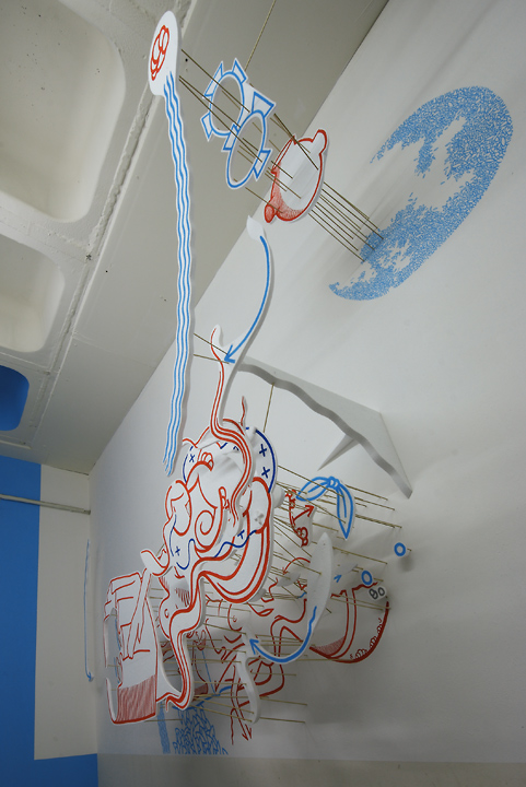 vor einer kleinteiligen blauen Verdichtung (blättrig, also organisch), die direkt auf die Wand