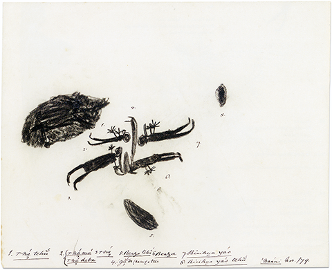Inspiriert, so eine schriftliche Erklärung in eine Zeichnung einzubringen, wurde Kater auch durch Zeichnungen und Aquarelle aus den Jahren 1875 bis 1881 von sechs San, Angehörigen der ältesten Bewohner des südlichen Afrika, die die Sprachwissenschaftler Wilhelm Heinrich Immanuel Bleek und Lucy Catherine Loyd in Kapstadt direkt und in ihrer Anwesenheit kommentierten... die Zeichner, die in der Regel "auf Aufforderung" zeichneten, erklärten während sie zeichneten ihre jeweilige Zeichnung... und die Sprachwissentschaftler, die in erster Linie ein Wörterbuch und eine Gramatik ihrer Sprache erstellen wollten, notierten anschließend diese Erklärungen auf dem Blatt. Es handelte sich also in der Regel nicht um autonome Kunst... die Zeichnungen begleiteten und ermöglichten Kommunikation.
